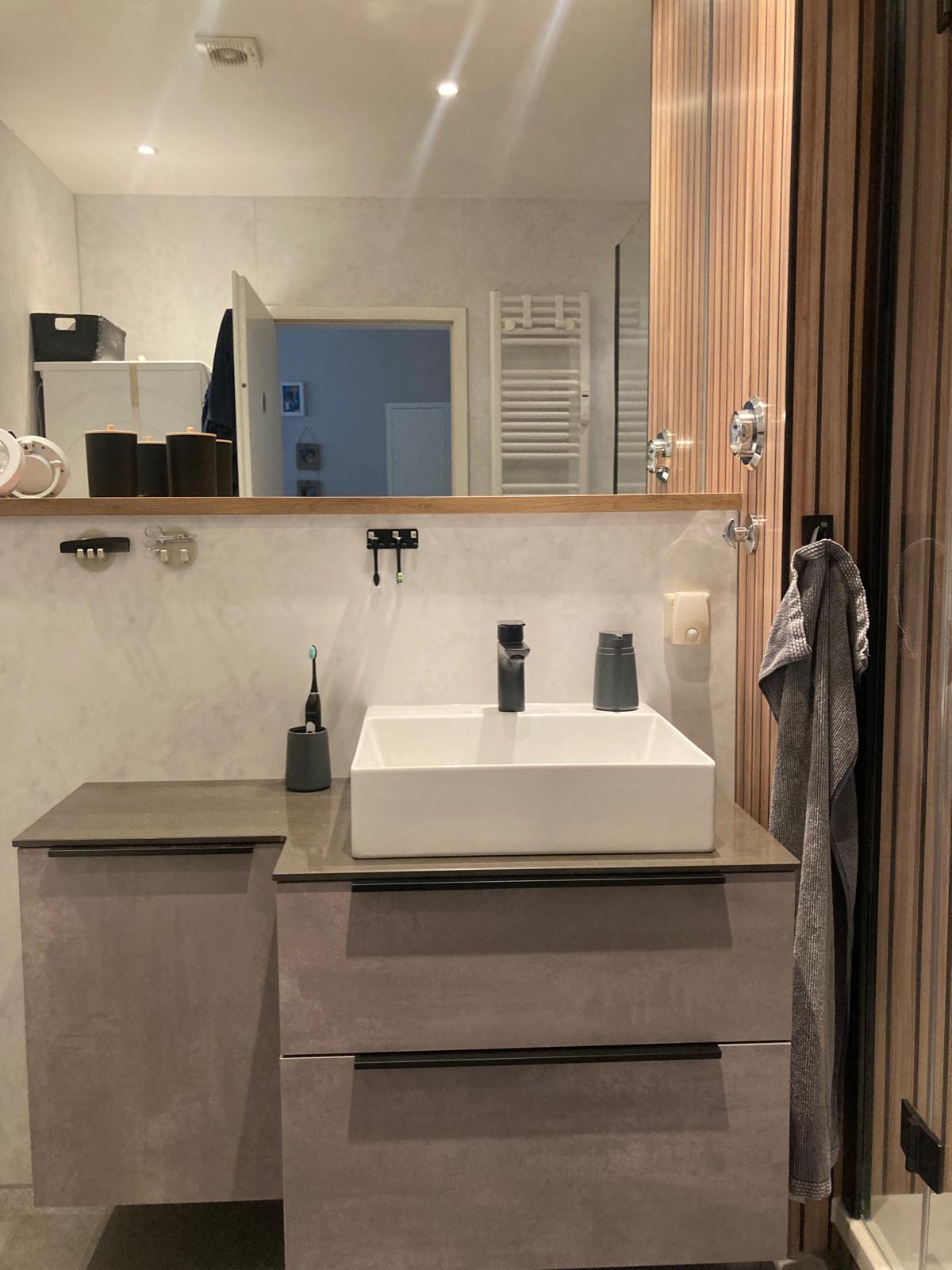 • Badewanne entfernt – neue, flache Dusche integriert: Die alte Badewanne wurde ausgebaut und durch eine flache, großzügigere Dusche ersetzt. Dadurch wirkt der Raum offener, bietet mehr Bewegungsfreiheit und erhöht den täglichen Komfort.