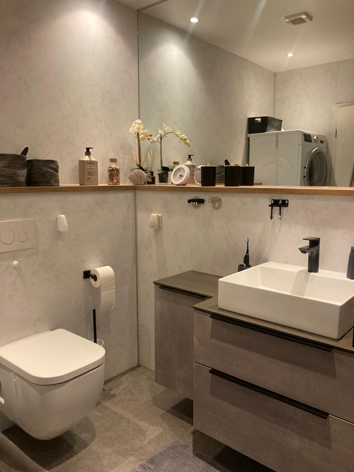 • Fugenlose Wandgestaltung mit Feuchtraumpaneelen: Das gesamte Bad erhielt eine hochwertige Wandverkleidung aus Feuchtraumpaneelen –