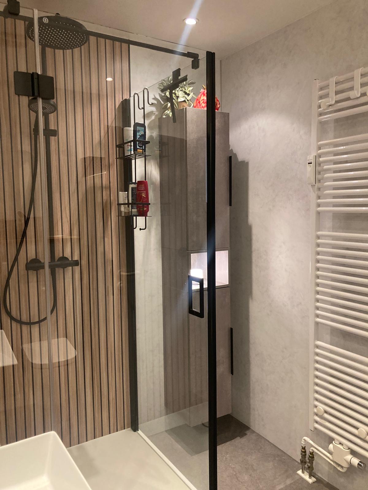 Das gesamte innenliegende Bad erhielt eine hochwertige Wandverkleidung aus Feuchtraumpaneelen – in zwei aufeinander abgestimmten Designs: warme Holzoptik für mehr Wohnlichkeit und elegante Steinoptik für eine ruhige, edle Atmosphäre. Zusammen erzeugen sie ein modernes, stimmiges Gesamtbild ohne sichtbare Fugen und mit minimalem Pflegeaufwand.